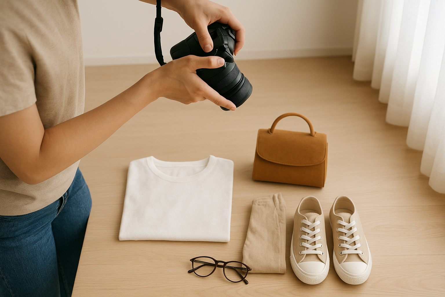提案画像: 木製テーブルの上にきれいに並べられたアパレルや小物を自然光で撮影しているシーン