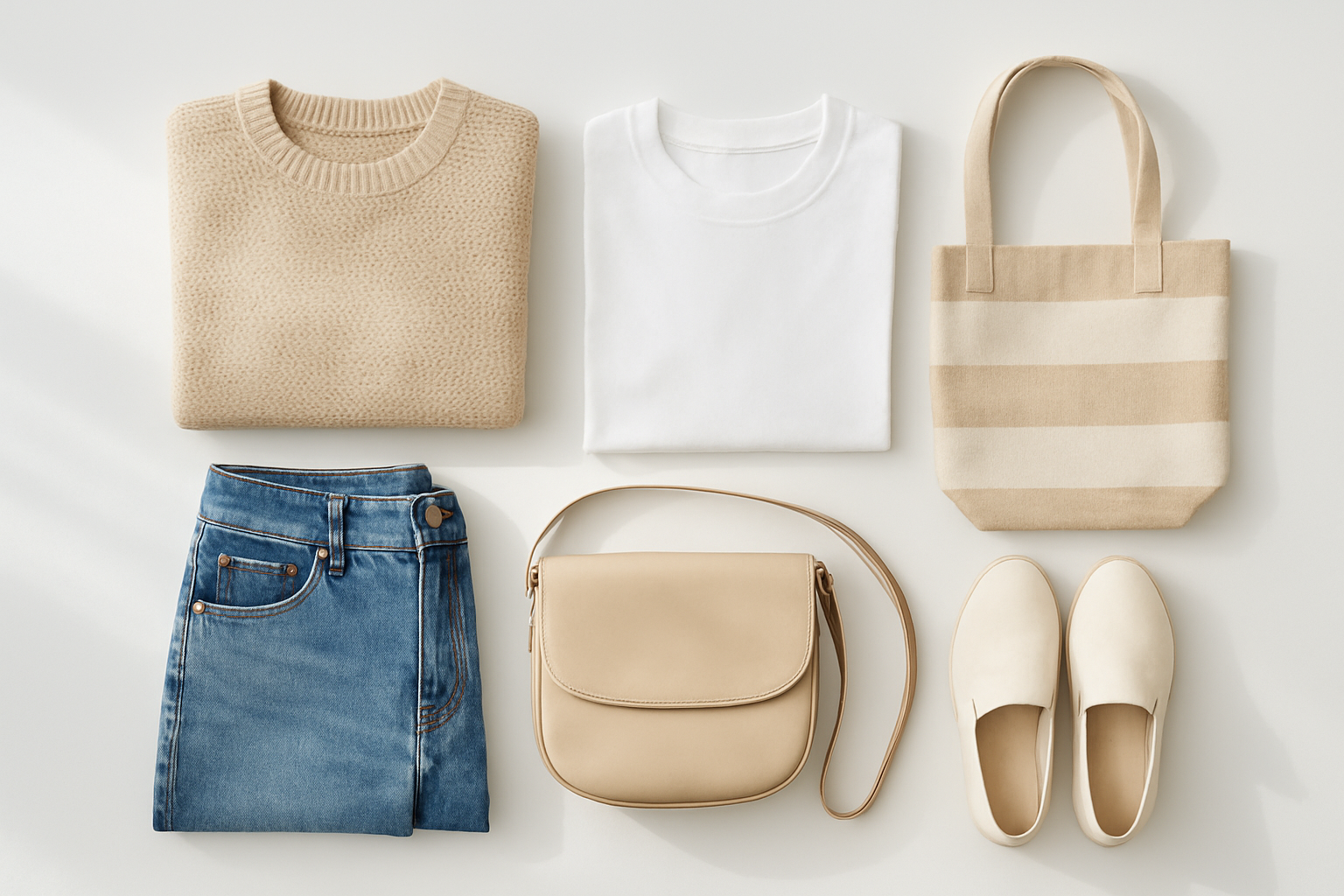 提案画像: 白背景の上にきれいに配置された洋服とアクセサリーを、真上から自然光で撮影した構図