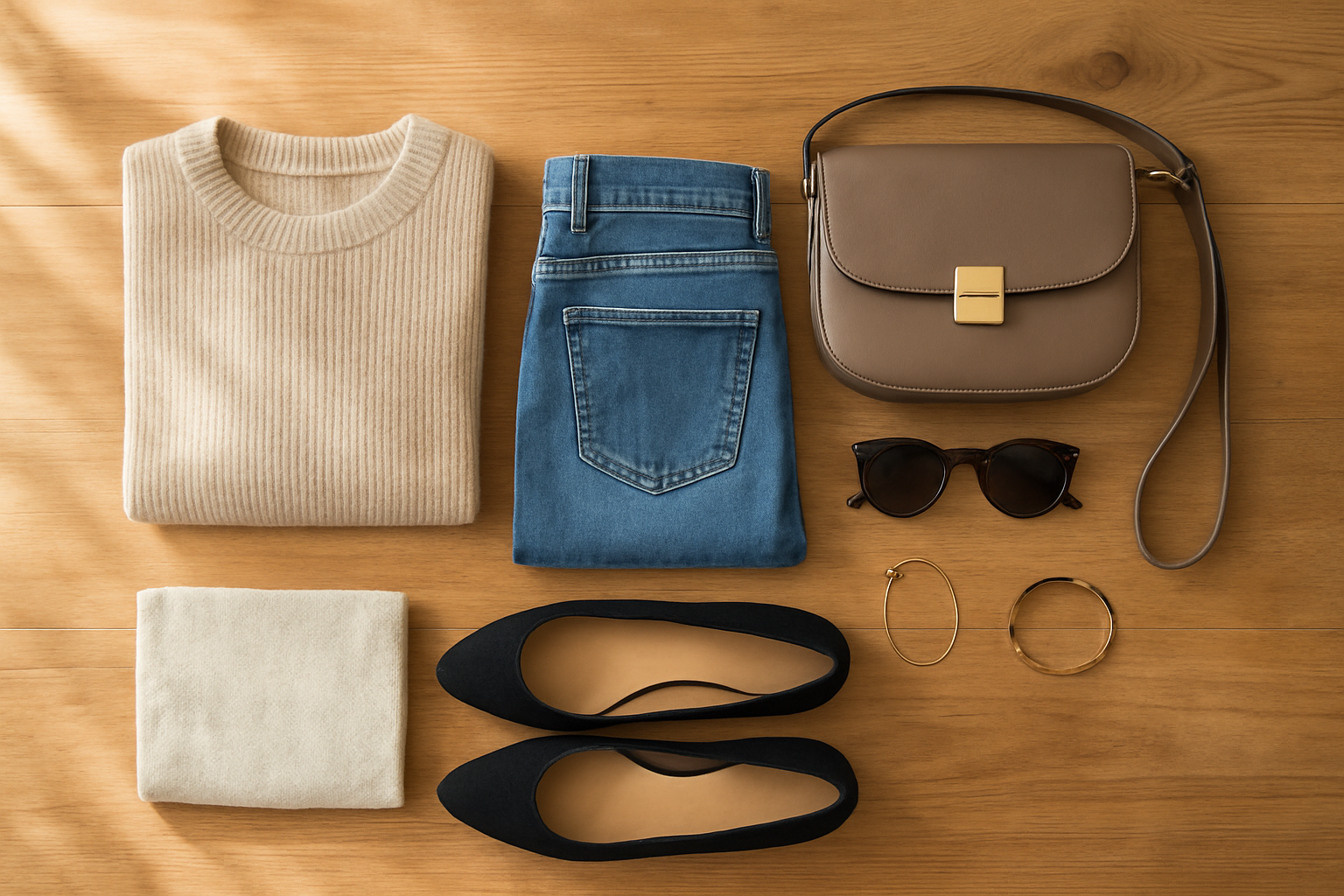 提案画像: 明るい窓辺でアイロンがけされたシャツ、磨かれたスニーカー、整然と並べられた小物が置かれた木製テーブル