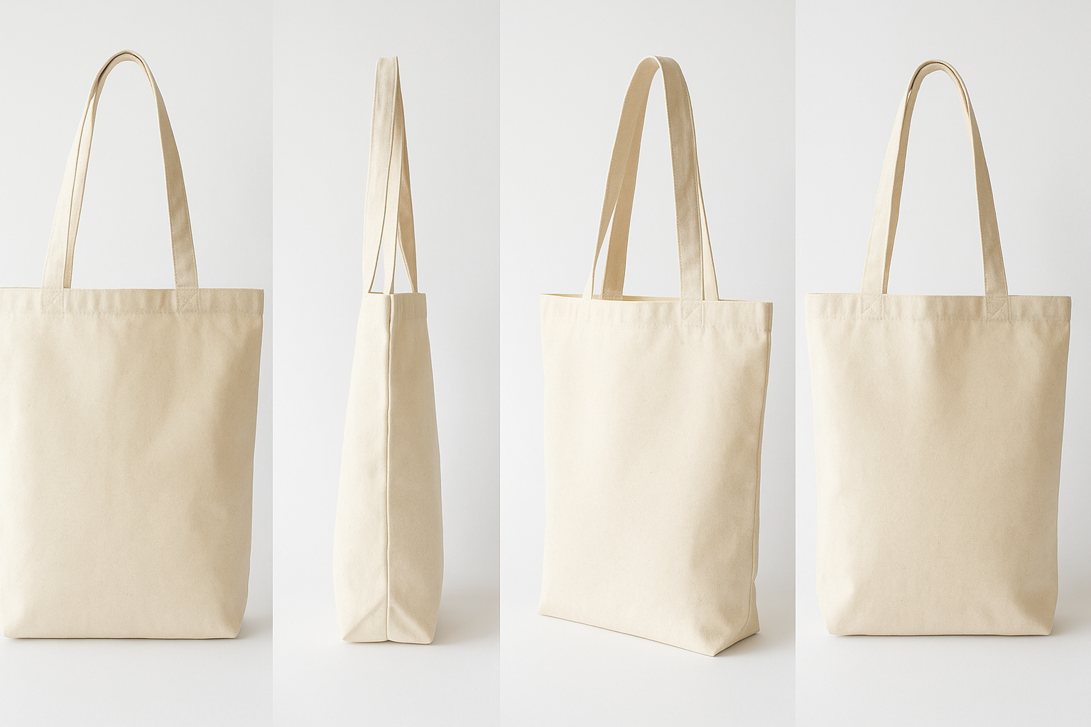 提案画像: 白背景の上に整然と並べられたTシャツ、バッグ、小物が自然光で撮影された構図