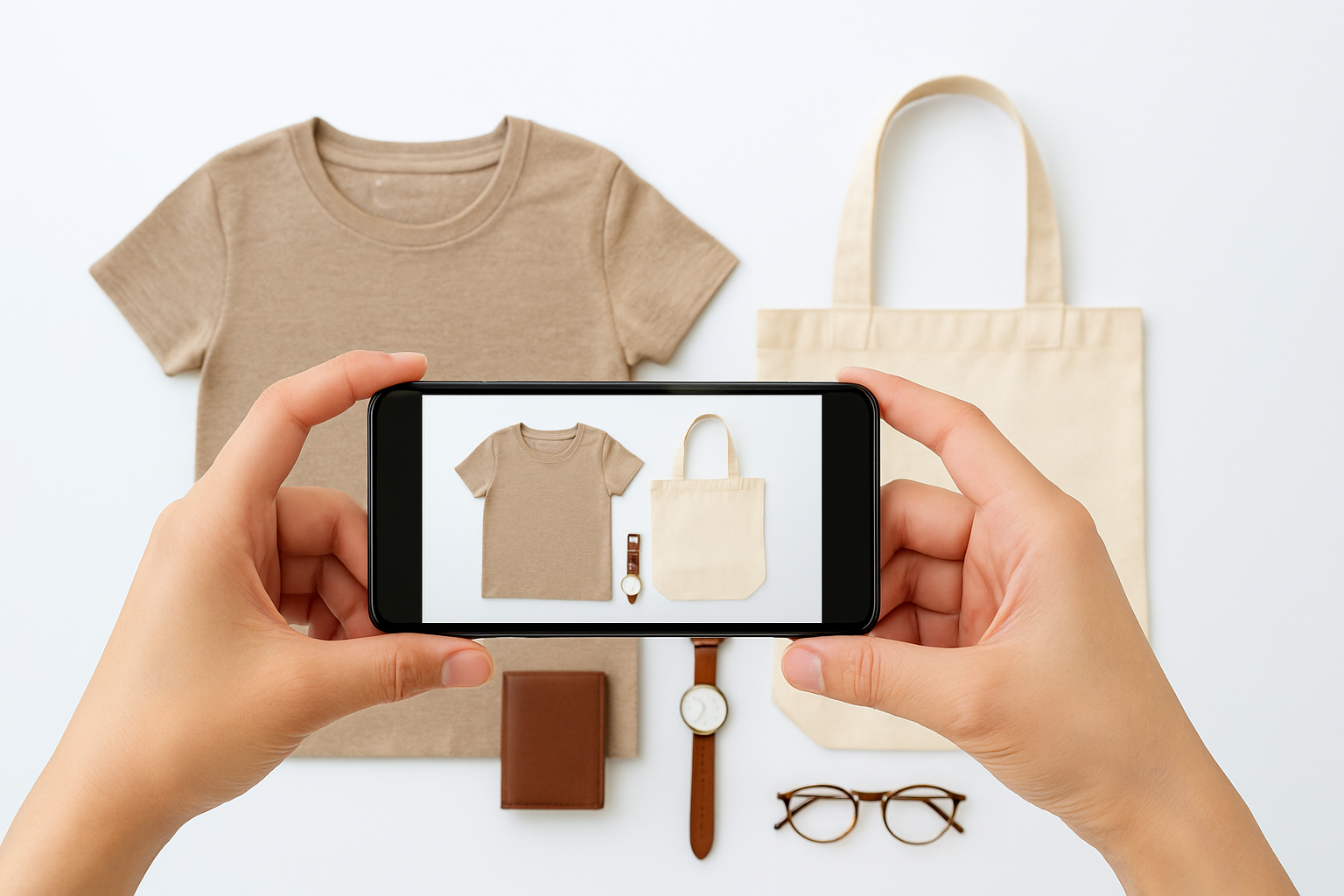 提案画像: 自然光で撮影された商品をスマホで撮影している手元の様子