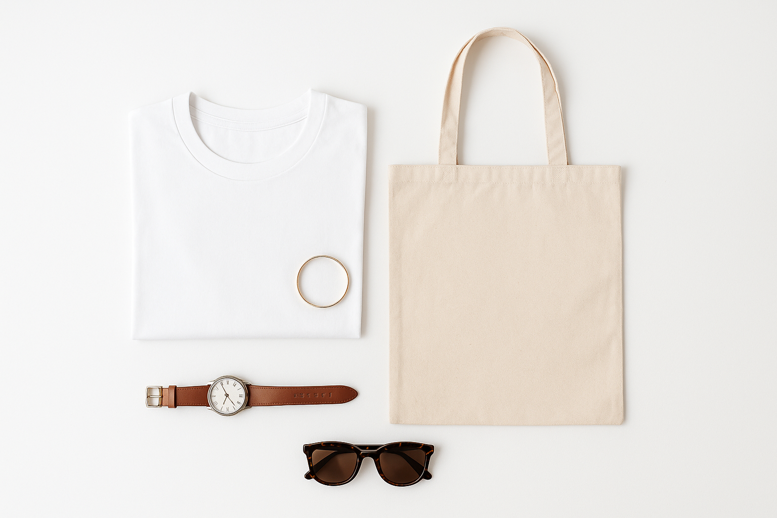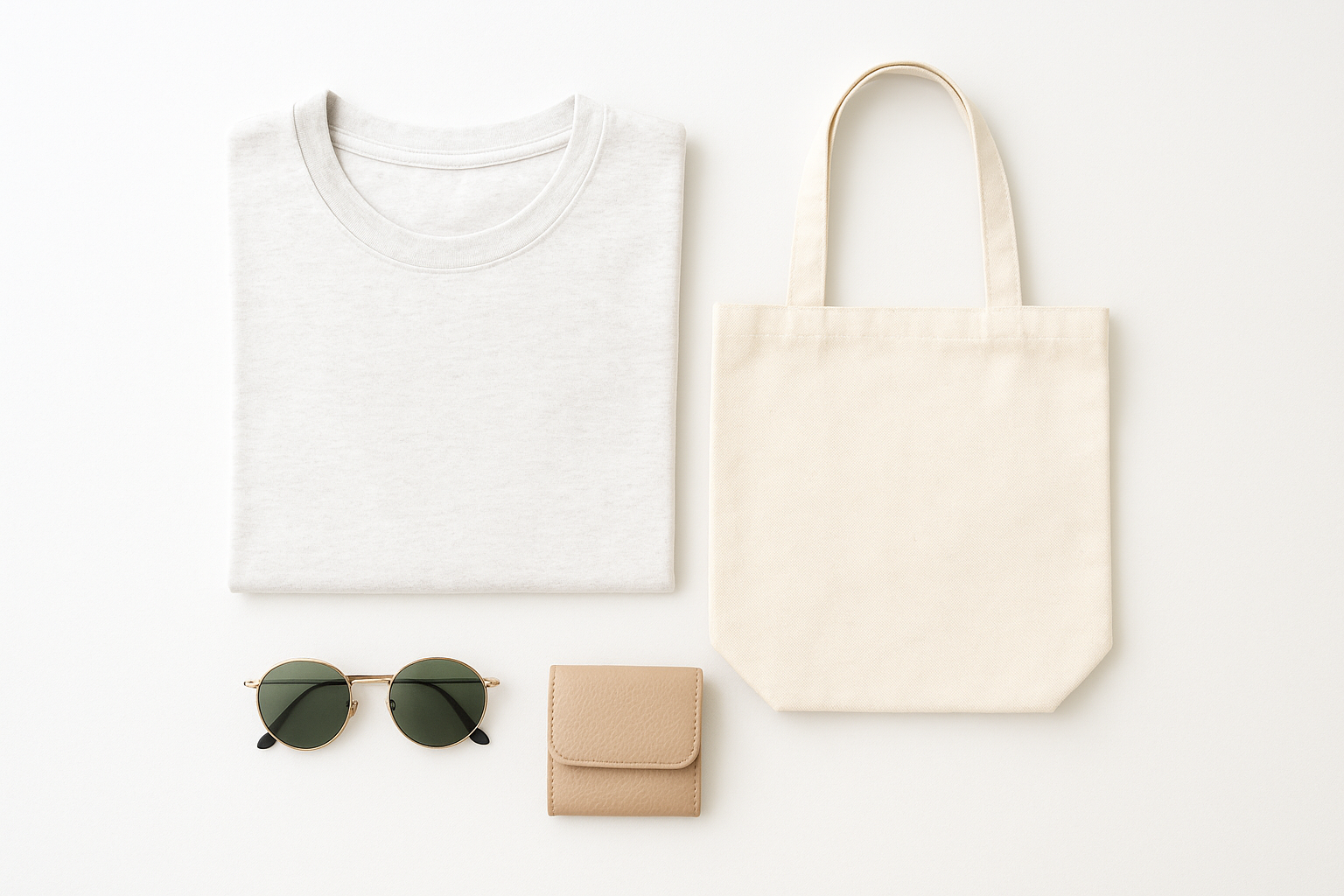 提案画像: 白背景の上にTシャツ、バッグ、小物が整然と並んでいる構図。上から見下ろした明るいライティングで、清潔感のある印象。